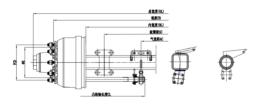 | 车轴型号 | 1000kg | (mm) | TR(mm) | (mm) | CL(mm) | AC(mm) | Studs 轮胎螺栓 | PCD(mm) | φH | (in) | NL(mm) | OL(mm) | |